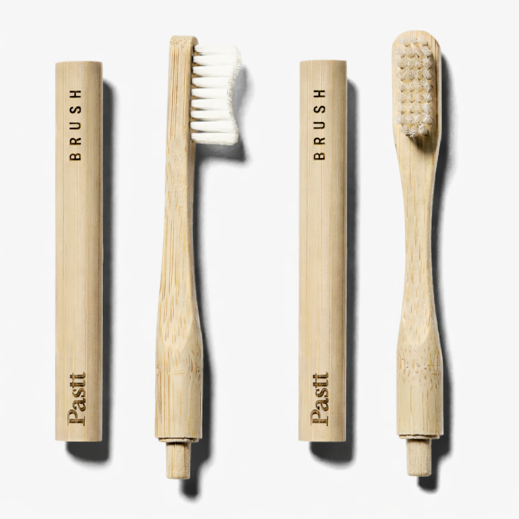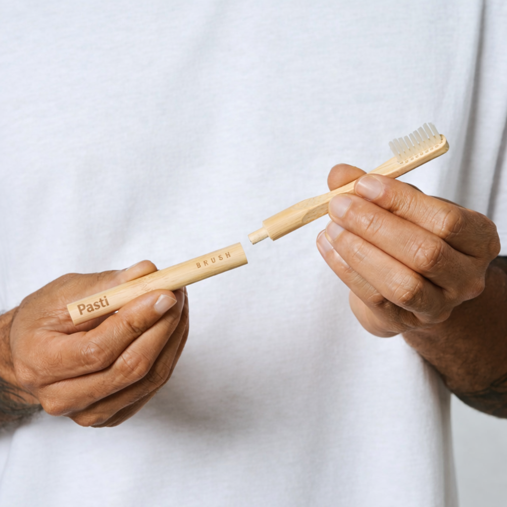 Cepillo de dientes 100% de origen vegetal, hecho de bambú moso, con cabezal desmontable para facilitar su transporte.